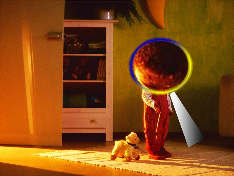 通过对椭圆选框工具、渐变工具、多边形套索工具、自由变换、扩展、扩边和球面化滤镜等命令的使用,模拟制作如图所示的将图像放在放大镜下的效果。