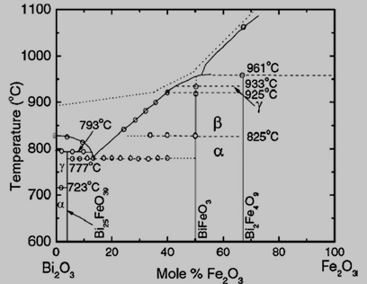 BiFeO3同时具有铁电性和反铁磁性,是一种典型的具有钙钦矿型结构的单相多铁性材料。并且具有高的反铁磁尼尔温度和铁电居里温度,引起了广泛的关注和研究[1]。但是,由于实验条件和BiFeO3本身结构所限,如图1.1所示。BiFeO3陶瓷只在较窄的温度范围存在,前期的工作大部分集中在制备纯相的BiFeO3粉体[2-4]。随着科学技术的迅速发展,近年来越来越多的工作开始集中在BiFeO3薄膜和BiFeO3纳米结构的研究上[5]。