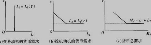再者凯恩斯的流动性偏好理论则是从货币因素来考虑利率问题,在凯恩斯看来,储蓄与投资在经济体系中属于被决定因素而非决定因素,而利率应该是属于货币经济的范畴,他是由货币供给量以及流动性偏好决定的。货币供给量是由一国货币当局通过各种政策性工具的实施来控制的,属于外生变量,所以利率应该由流动性偏好所决定。一般来说,这些资产的价格与利息率是负相关。但是当利率降到很低的水平时,人们会认为利率已经不可能在下降了,认为利率可能会上升,债券会价格下降,货币的需求弹性因此会变得无限大,遂产生流动性偏好陷阱。综上所述在经济学上,一般认为货币的总需求可以表述为:Md = L1 + L2 = L1(Y) + L2(r)如下图所示: