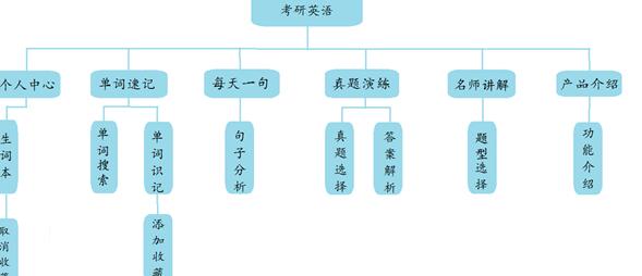 如图2所示,考研英语学习系统下分为单词速记模块,每天一句模块,真题演练模块,名师讲解模块,个人中心模块以及产品介绍751大模块。