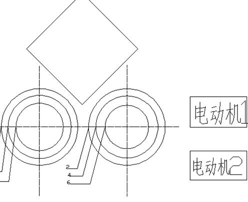 电动机1处的小带轮带动大带轮1运动,电动机2处的小带轮带动大带轮2运动,两根轴做相向运动,从而由切断刀3和4将塑胶桶强制挤压切断,再由破碎刀5和6切成小块掉入下方的下箱体。