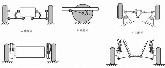 悬架具有繁多的种类,按照导向机构区分,汽车悬架可以分成独立悬架和非独立悬架两种。非独立悬架的典型特征是两个车轮用一根刚性梁或者断开式车桥连接,两个车轮在通过不平路面时会相互影响,通过性和平顺性都不如独立悬架,现代轿车已经很少采用此种形式悬架,本文不做过多介绍,重点研究独立悬架,独立悬架没有刚性梁,它是让两侧车轮单独与车身或车架连接,两侧车轮可以独立跳动,具有较大的跳动空间,便于转弯。根据导向机构具体的形式又可以分成横臂式、纵臂式、斜臂式、麦弗逊式、烛式等等类别[3]。