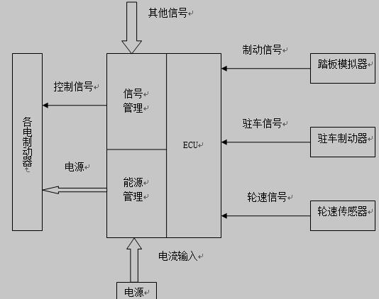 如图1.1所示,和普通的制动系统有一定的差异,全电制动的传递介质是电力,后者是液体或压缩空气,这样就不需要使用额外的管路及传感器,使得制动时间在一定程度上降低。全电制动系优势有许多方面。第一是与众不同的电动制器,制动管理流程也与众不同的。其次,因为汽车直接利用电力驱动制动器,摈弃了传统制动系统中的液压机构,由中央电控单元(ECU)来控制系统,同时每一个制动器ECU各自控制着制动器。当今,BBW技术变得越来越成熟,已经推出了概念车,由电一液ABS控制系统联合制动。