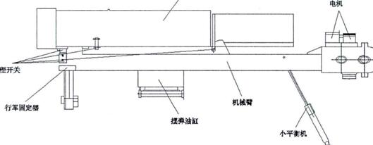 弹药传输机械臂作为大口径自行火炮自动装填系统的重要部分,要实现任意射击任务中弹药的自动装填。弹药传输机械臂的功能是接受来自弹仓的药丸经过回路运算输出控制电压将机械臂旋转到给定角度然后由输弹机送至炮膛指定位置。一般来说,在实际环境中弹药传输机械臂基本上会处于一种高速负载的状态,在进行设计弹药传输机械臂的时候我们就需要要求在弹药传输过程中弹药传输机械臂需要快速到达指定位置并具有小的振动以及高的定位精度。图2.1所示弹药传输机械臂机电系统有行程开关、行军固定器、托弹盘、摆弹油缸、机械臂、小平衡机、电机等组成。