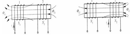 电磁感应基本原理如图2.2所示。图2.2是两个离得很近的线圈,匝数分别设为 和 , 的参考方向如图所示,则有每个线圈电流的方向和该电流产生的磁通的方向符合右手螺旋法则。