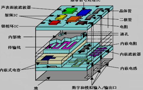 低温共烧陶瓷(LTCC,Low Temperature Co-fired Ceramic)技术是MCM-C中一种多层布线的陶瓷基板技术,其开发目的就是为了实现军工电子产品设备的小型化[16-20]。通过使用某种厚膜材料,并根据之前准备好的设计,将基板、电子器件等在一定温度下进行一次性烧结,这样得到的电子封装具有较高的集成度和较好的性能。LTCC技术可以将各种无源器件置于模块内部,并与内部介质互联,而在模块的外表面可安装IC芯片及表贴有源元件,从而得到无源器件和有源器件高度集成化的模块,具有良好的高频性能文献综述。随着电子设备在卫星通信、航天领域、单兵作战系统中的广泛应用,电路的高集成度、多功能化、高稳定性对整机来说显得越来越重要,而LTCC技术因其集成度较高、性能较稳定、生产成本较低等特点受到了广泛的关注,图1.3.1为LTCC无源有源模块电路图。