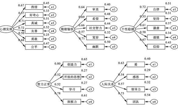 为验证量表所包含文度的合理性, 分别对五个分量表进行验证性因子分析, 具体标准化因子负荷拟合结果详见图1。