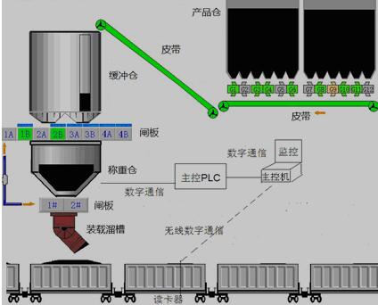 2、缓冲仓配煤系统:上位机接收车厢信息之后,在显示屏上进行显示,操作人员可以根据显示对错误信息进行必要的修正,然后上位机把调整过的数据传给PLC控制系统。之后PLC系统根据数据控制产品仓和皮带轮,把煤炭运输到缓冲仓,准备装车。