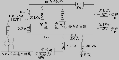 此结构则用了局域划分思想,将一整套的FREEDM划分为若干个区域,每个区域将配置两个SSFID提供保护,这样将可减少SSFID的使用数量。图中一共包含四个SSFID,分别将网络分成三个部分,其中每个部分都含有负载和分布式电源等必要的设备,且均由SST链接进入网络,此结构降低了运营成本低,可行性强,但对于整个系统中继保的要求更高[4]。